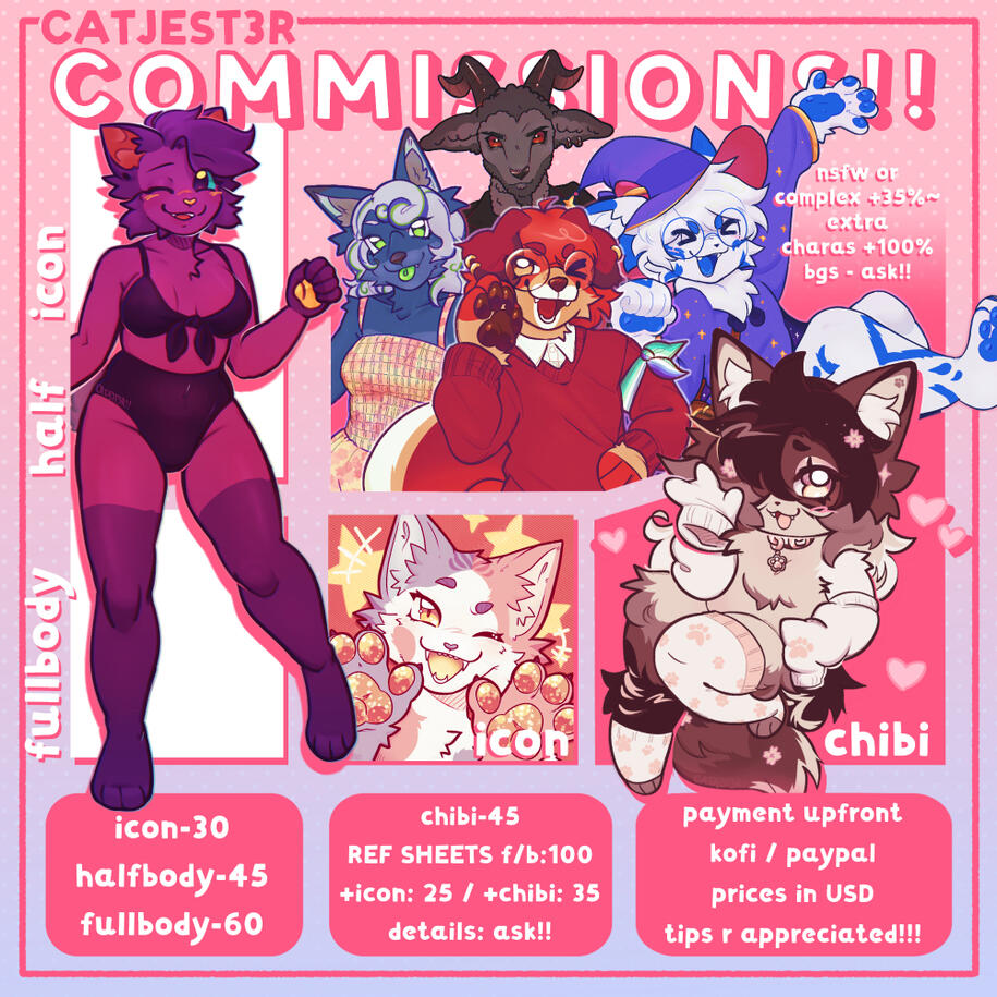 any species furry, scalie, avian, pokemon, mlp, ferals, keminomimi/partial furries, as well as humans! dont be afraid to ask for something not listed here- i love to try new things!!i mostly draw ocs, but i can also do canon characters from games/shows, as well as oc x canon!!i also do pngtubers for an added $15 on any comm!! they come with blinking and mouth open/close, but can also add expressions/props!! examples belowWONT DRAW: